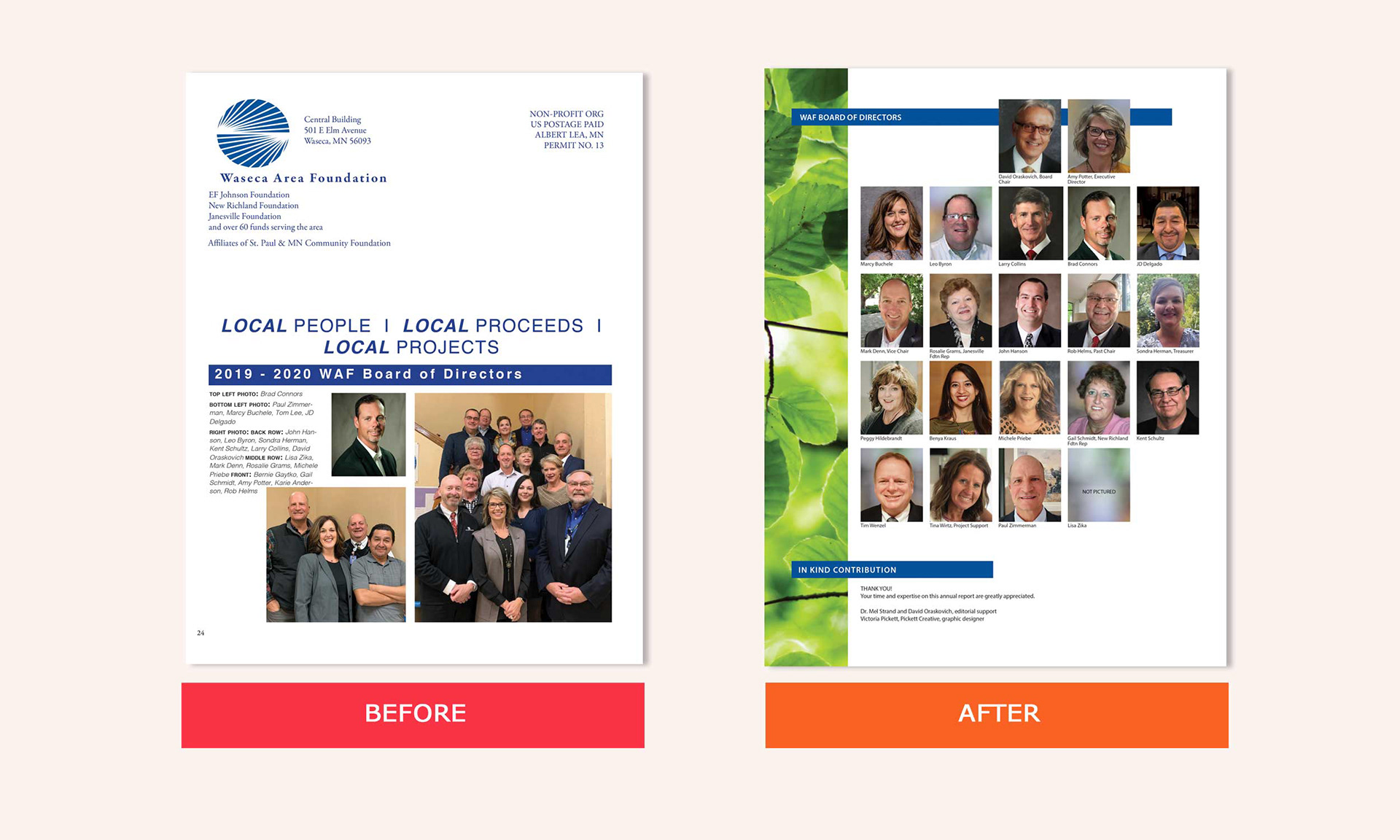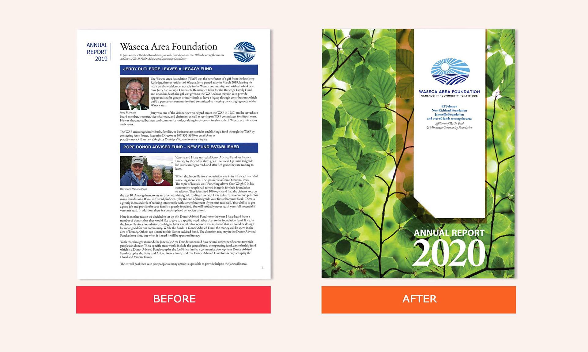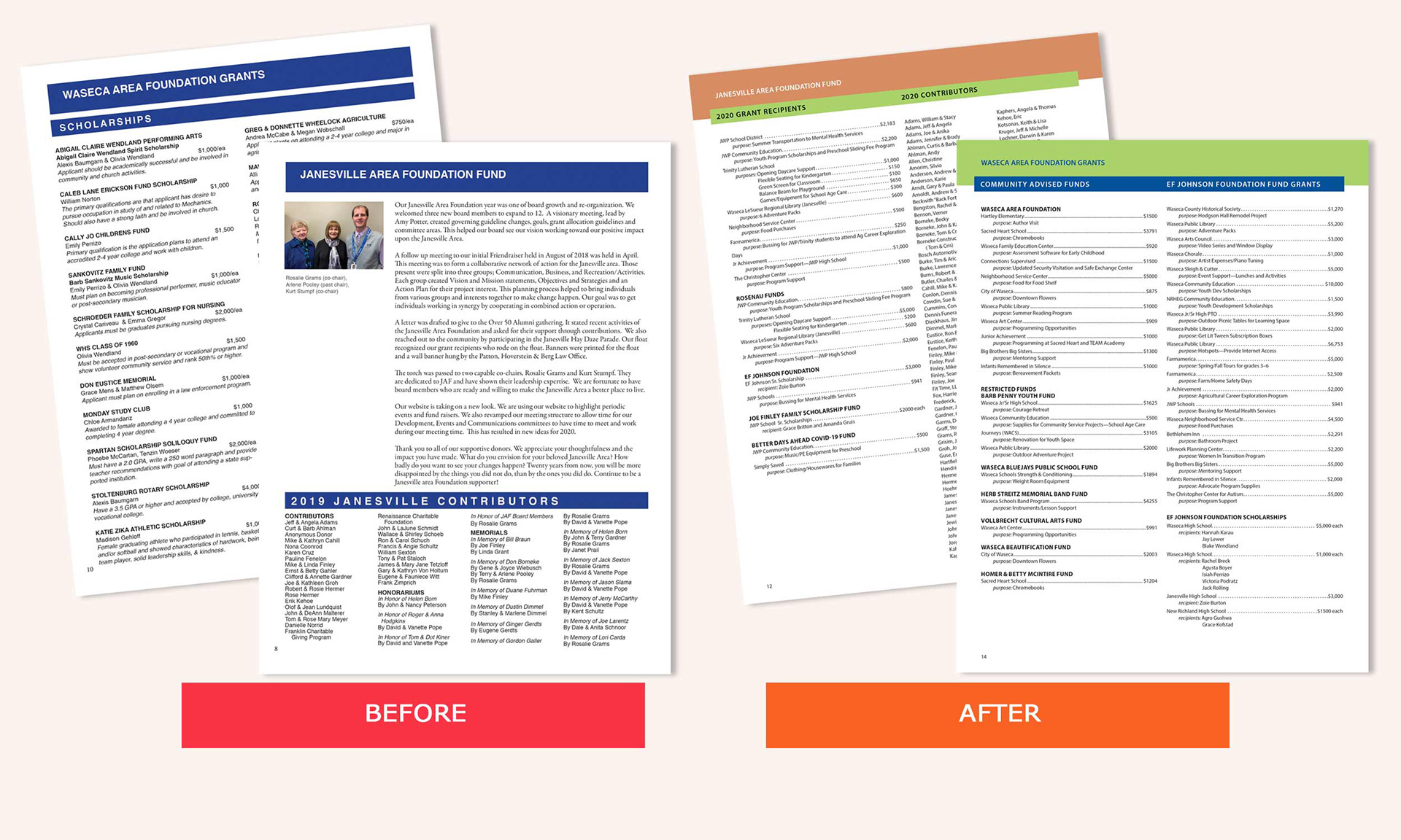The previous report looked more like a newsletter than a professional report. The biggest change was using color to differentiate between the different funds and program that are highlighted.