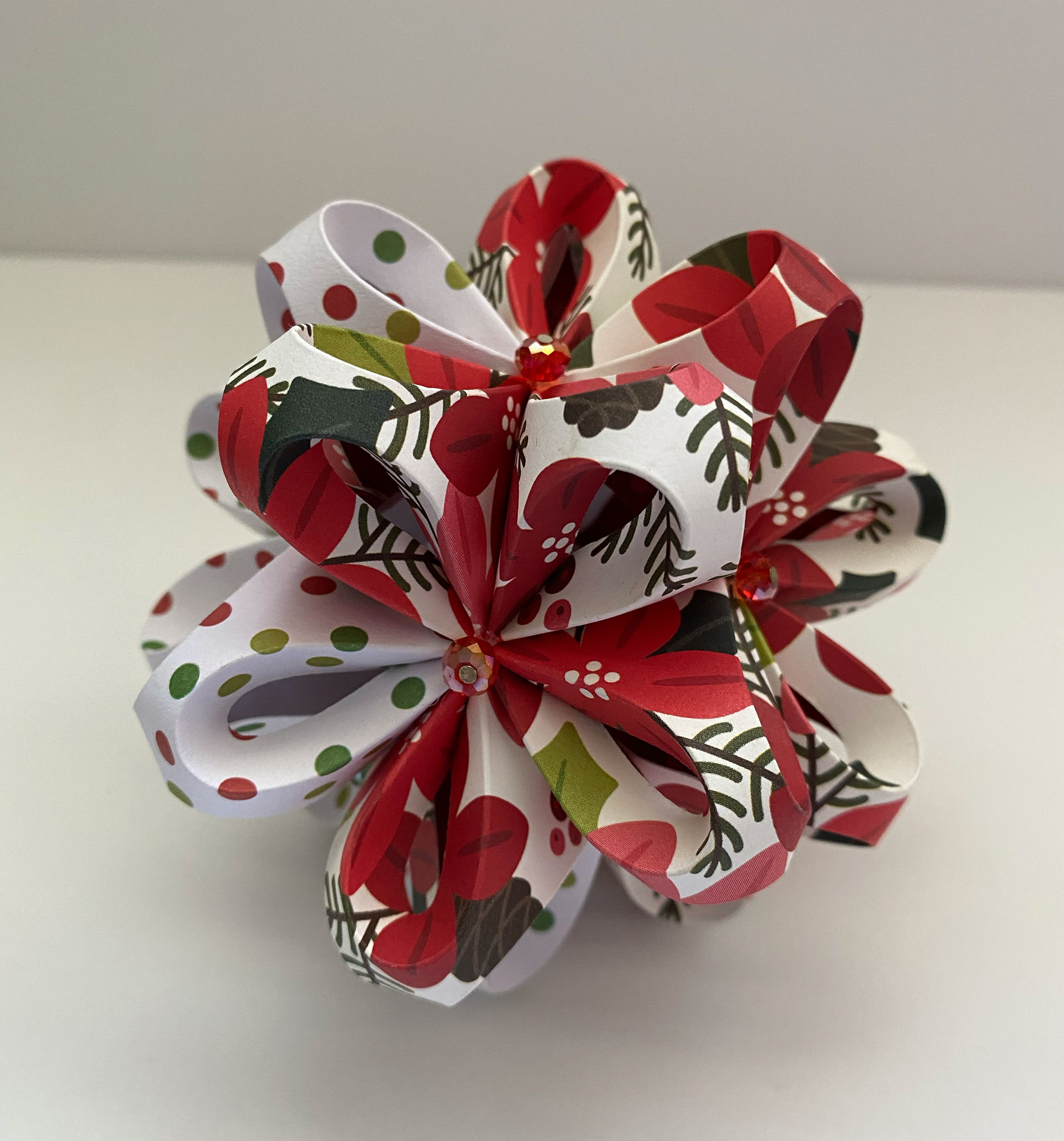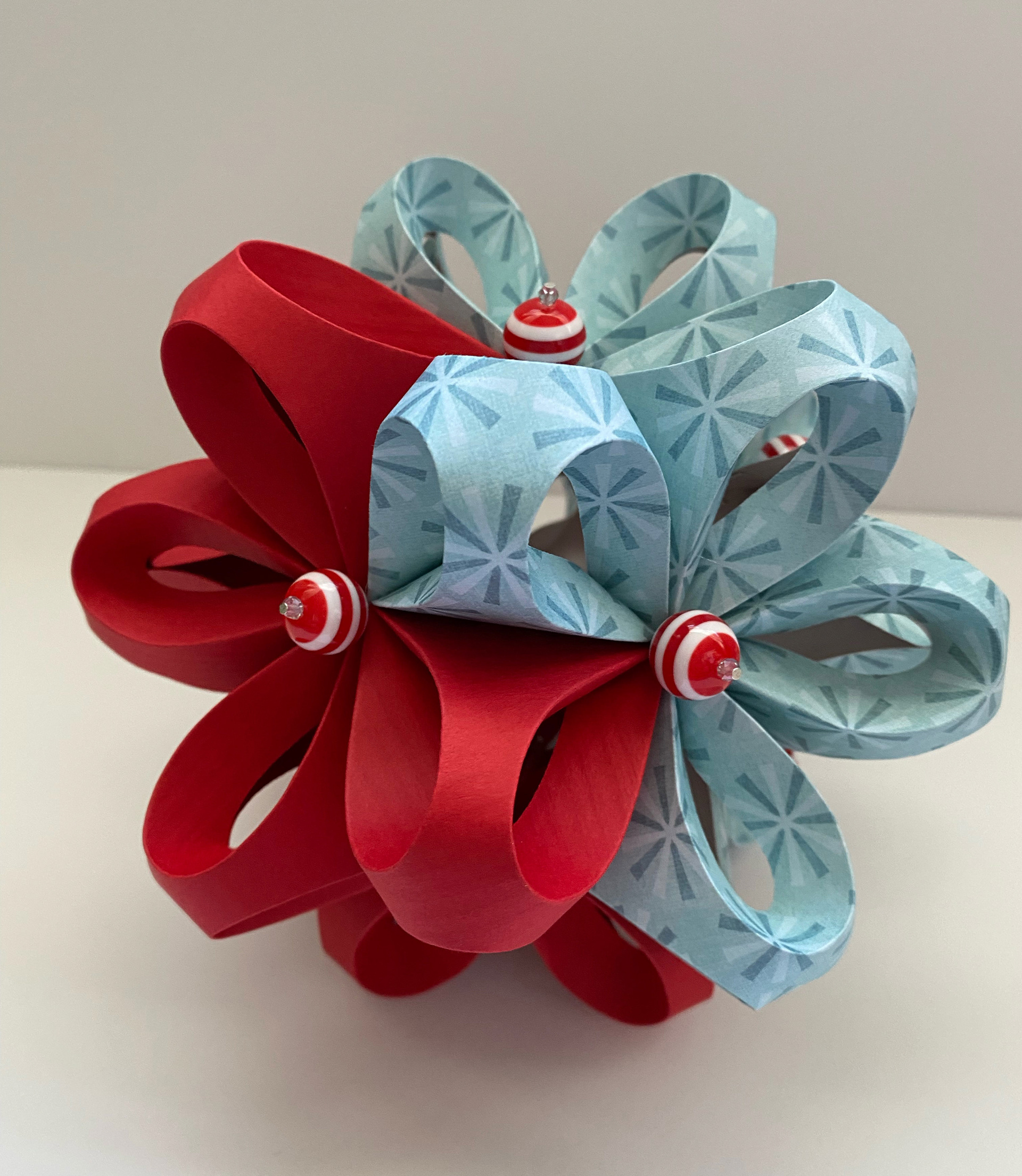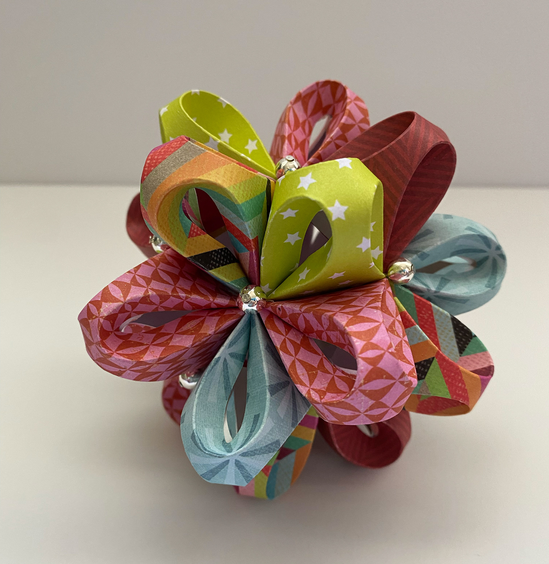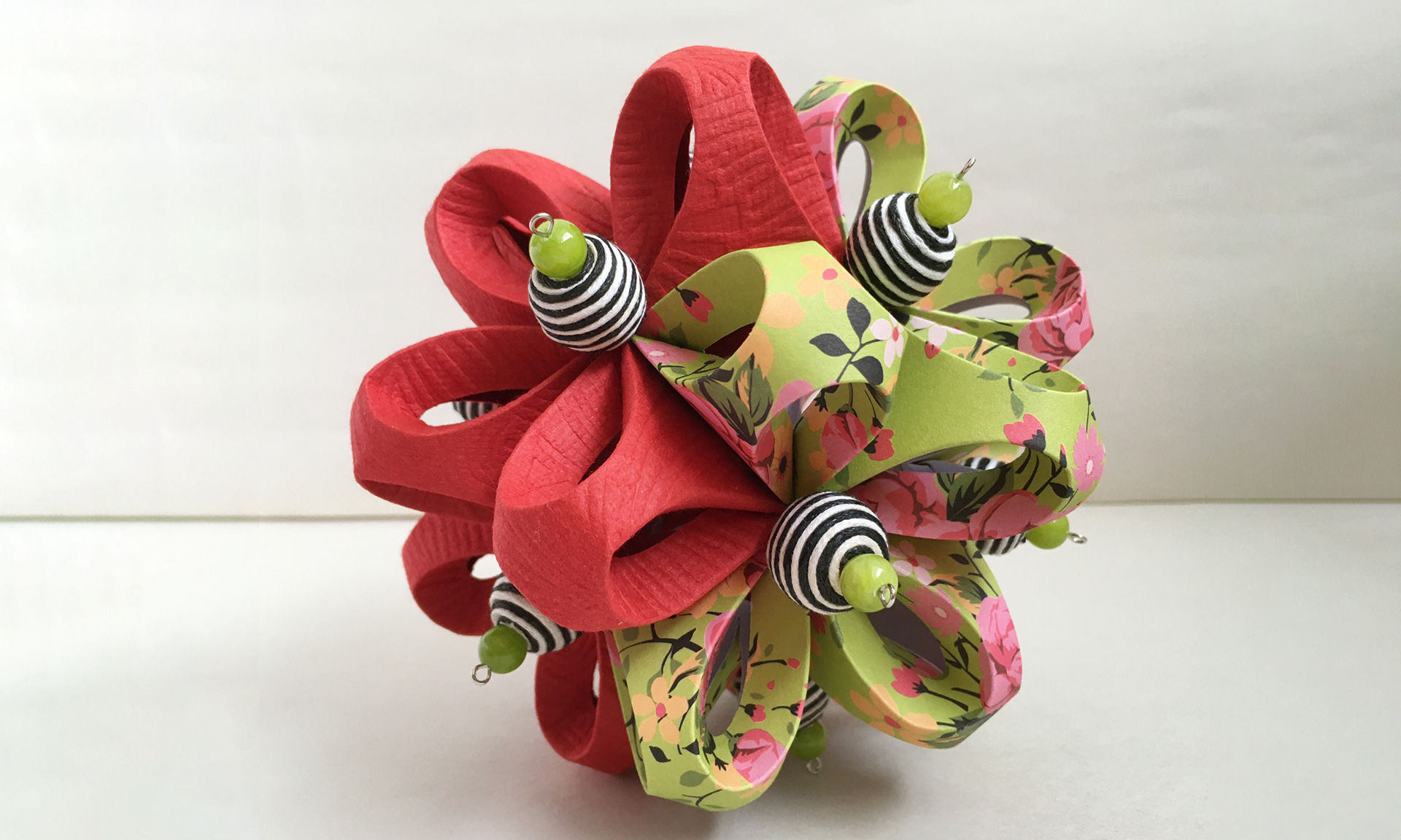 It takes 20 individual folded modules to create one of these pieces in a multistep process. They are made with archival cardstock and each center has a beautiful bead that adds to the support of the structure. This course takes you from flat paper to final piece.
