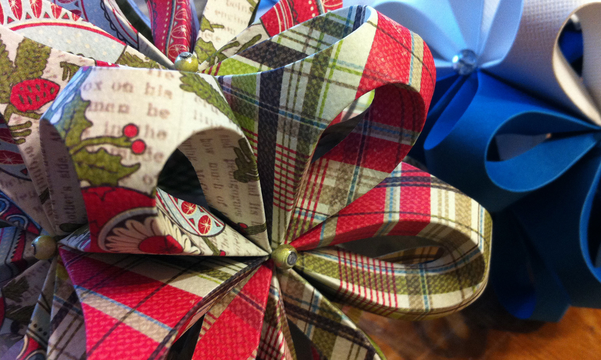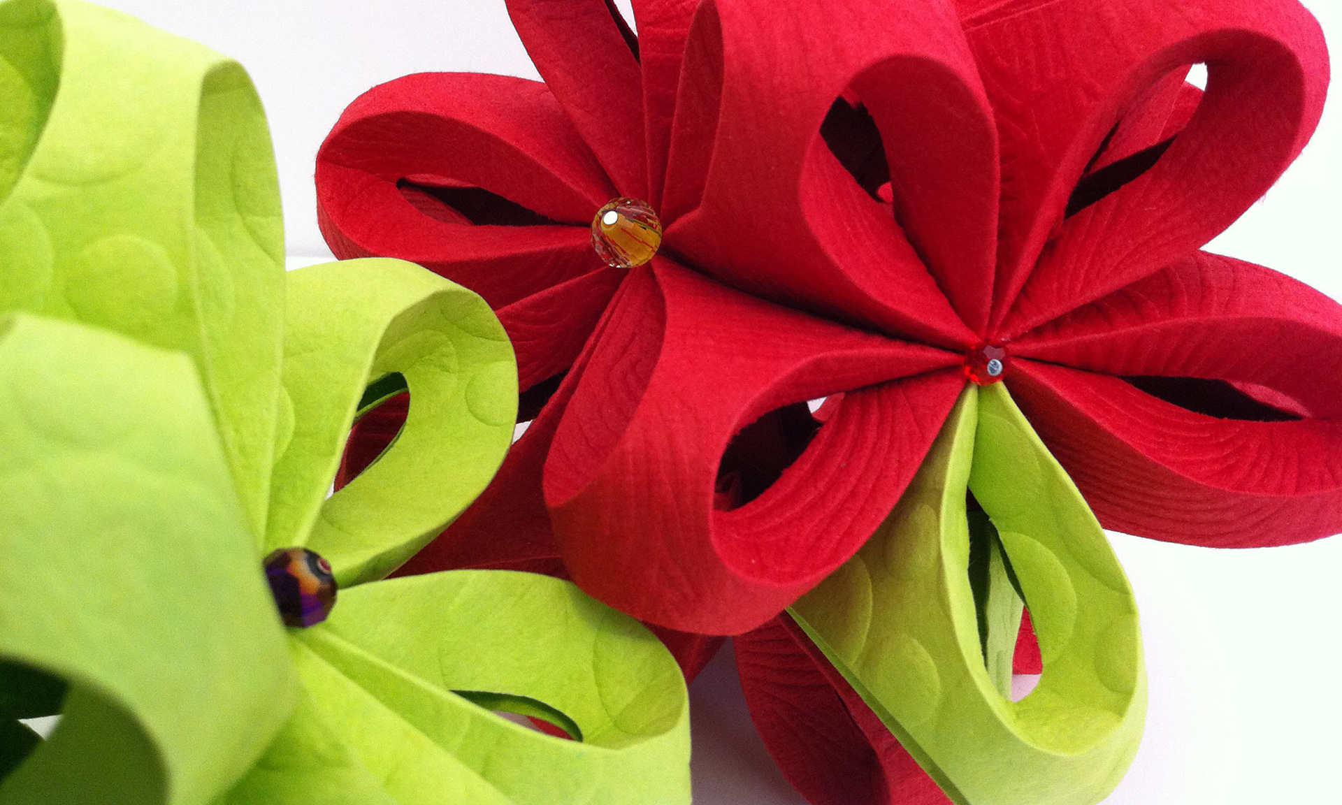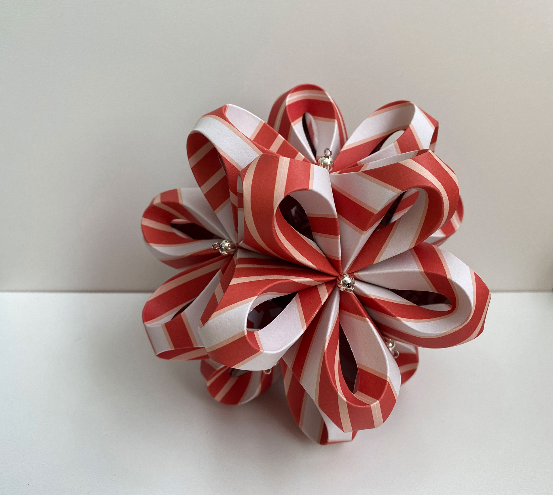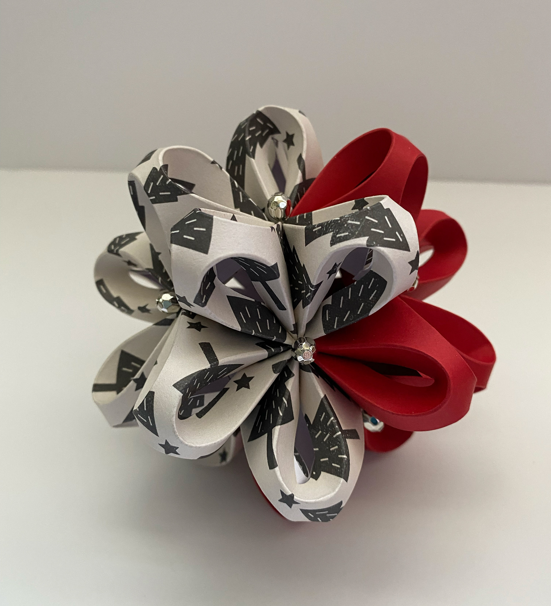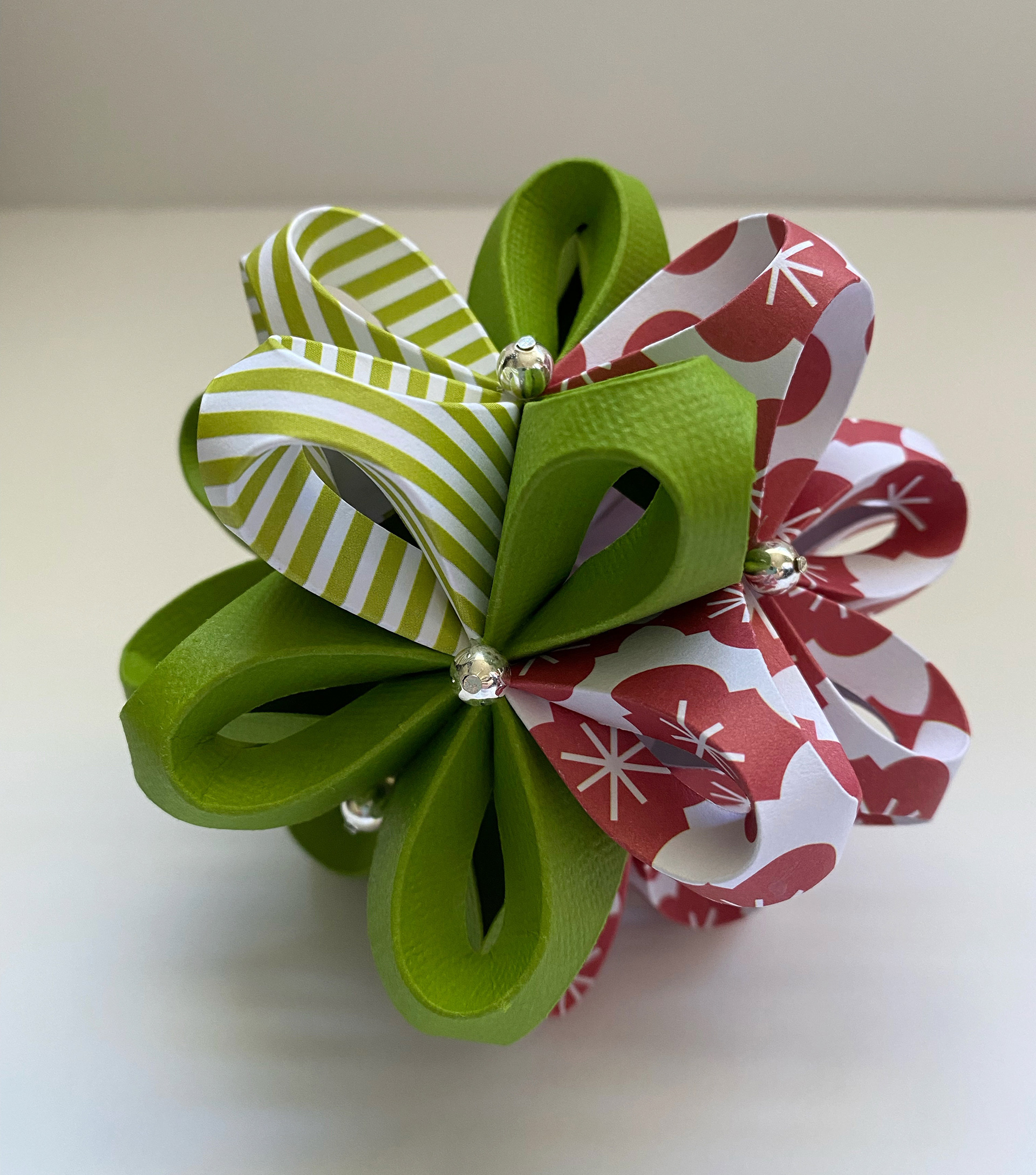 It takes 20 individual folded modules to create one of these pieces in a multistep process. They are made with archival cardstock and each center has a beautiful bead that adds to the support of the structure. This course takes you from flat paper to final piece.